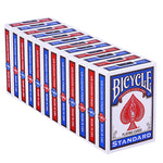 Docena de Baraja Póker Bicycle Standard con 54 Naipes 100% plastificada, ranurada para un mejor manejo y deslizamiento, fácil de barajear. Alma negra en su impresión que impide ver a contra luz . El empaque...
