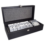 Disfruta de una tarde de juego con este increíble dominó profesional de 4 capas de acrílico con un elegante diseño en maletín de madera forrado de curpiel negro y finos detalles en hilo a los bordes, hecho con materiales de alta calidad que frengie ofrece desde 1995.