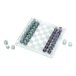 - Incluye: Tablero de juego de cristal, Peón, Torre, Caballo, Alfil, Reyna y Rey de acrílico, 24 Fichas inglesas de acrílico